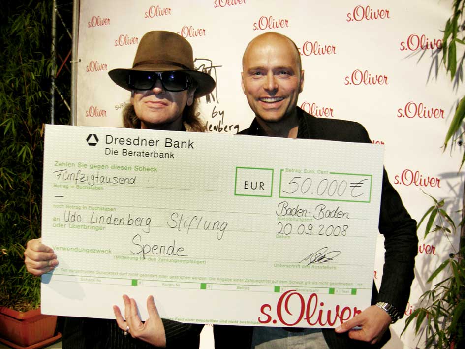 Die Udo Lindenberg Stiftung hat von der S.Oliver Group eine erste Spende von € 50.000,- erhalten. Axel Steuck (Head of Marketing, S.Oliver) überreichte im Rahmen des SWR3 New Pop Festivals einen entsprechenden Scheck an Udo Lindenberg (Foto).