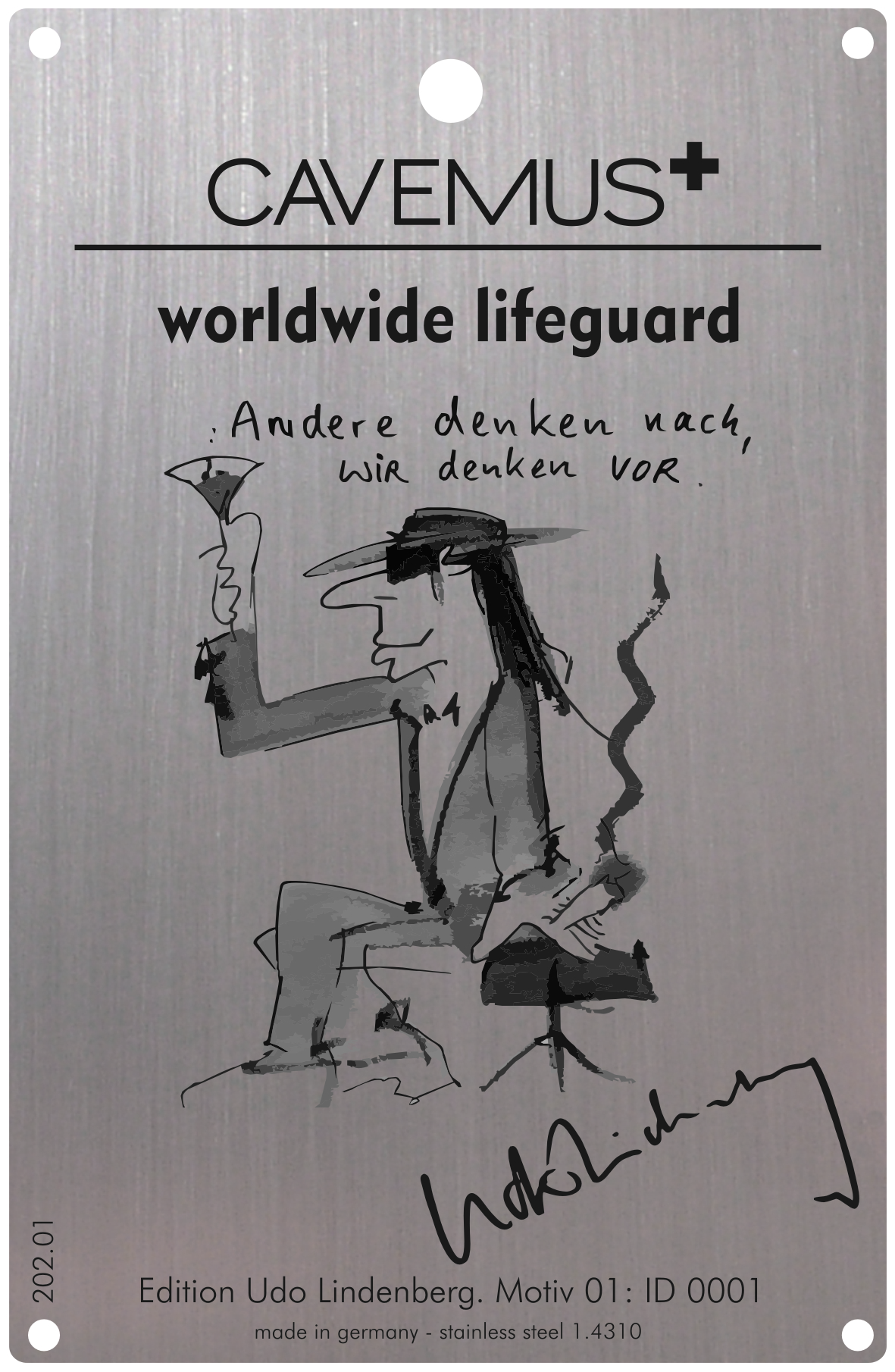 Das Produkt hört auf den Namen CAVEMUS® . Er kommt aus dem Lateinischen und bedeutet so viel wie „sich darum kümmern“ oder „Hilfe bieten“. Die Idee: Weltweite Sicherheit und Identifikation im Notfall durch eine Internetdatenbank in Verbindung mit einer „unkaputtbaren“ Karte. Sie ist aus hochwertigem, federharten Edelstahl mit nur 0,2 mm. Im Rahmen der neuen Kooperation wird jede CAVEMUS-Card mit einem original Udo-Lindenberg-Portrait versehen, per Laser signiert und einzeln nummeriert.