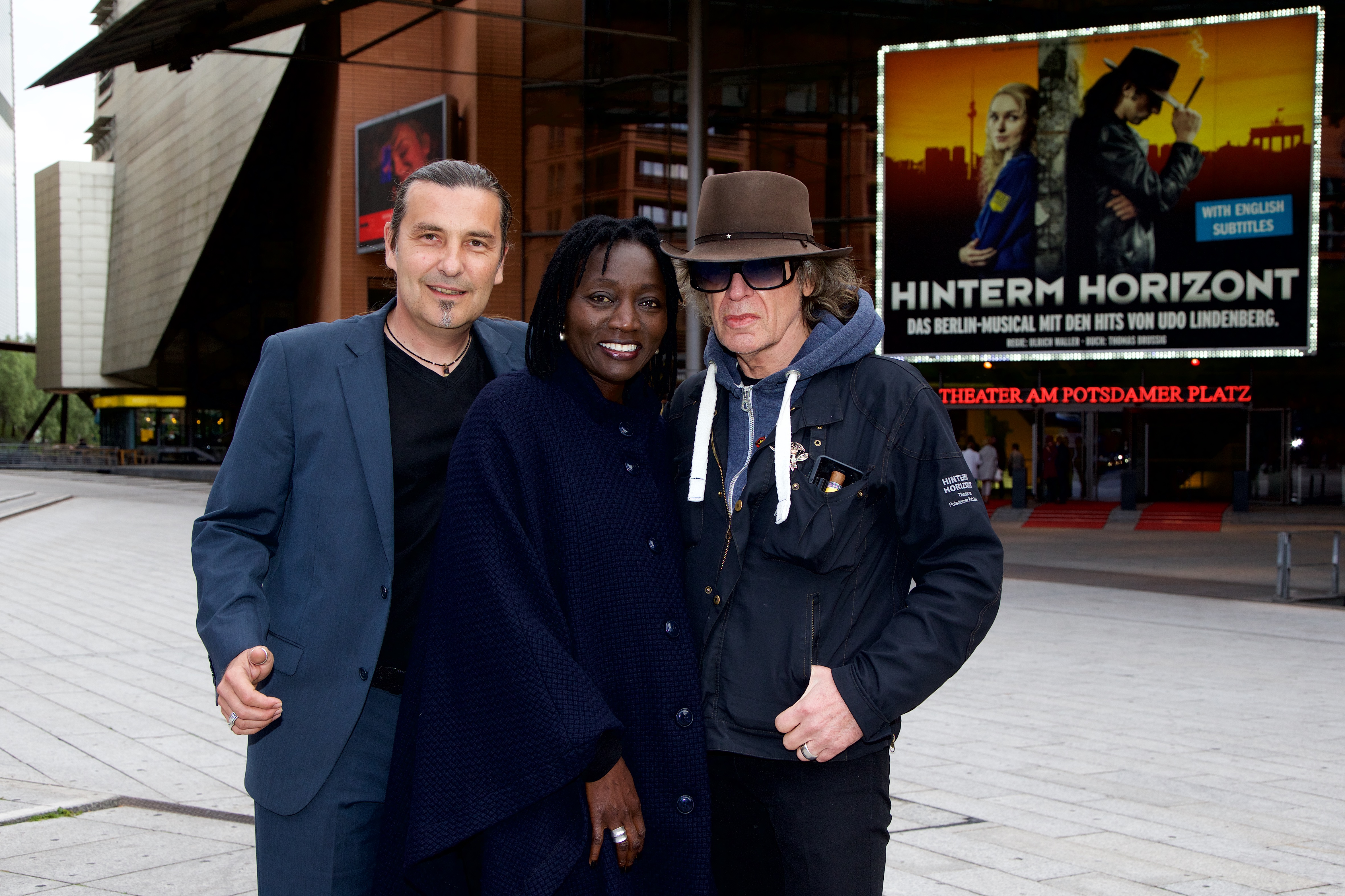 Hoher Besuch bei Berlins erfolgreichstem Musical HINTERM HORIZONT: Dr. Auma Obama, die Schwester von US-Präsident Barack Obama, besuchte im Rahmen ihrer Vorbereitung „Sauti Kuu Act Now Jugend Award 2015“ am Freitagabend die Vorstellung des Musicals. Udo Lindenberg ließ es sich nicht nehmen, den Ehrengast persönlich im Stage Theater am Potsdamer Platz zu begrüßen. „Ich freue mich sehr die großartige Aktion mit tragen zu können“