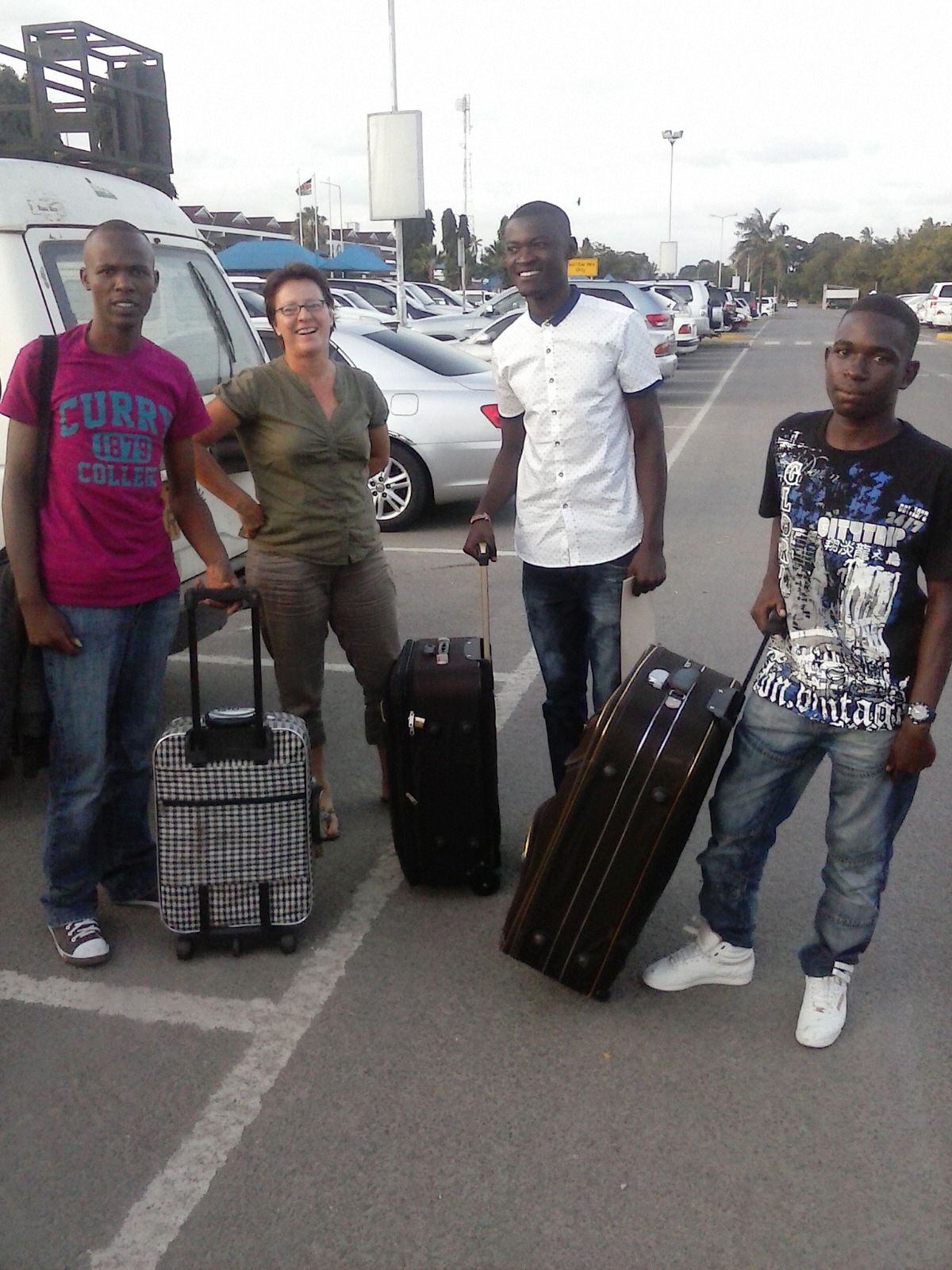 Das Bild zeigt die drei mit Angelika Janicke von der Udo Lindenberg Stiftung am Flughafen von Mombasa.