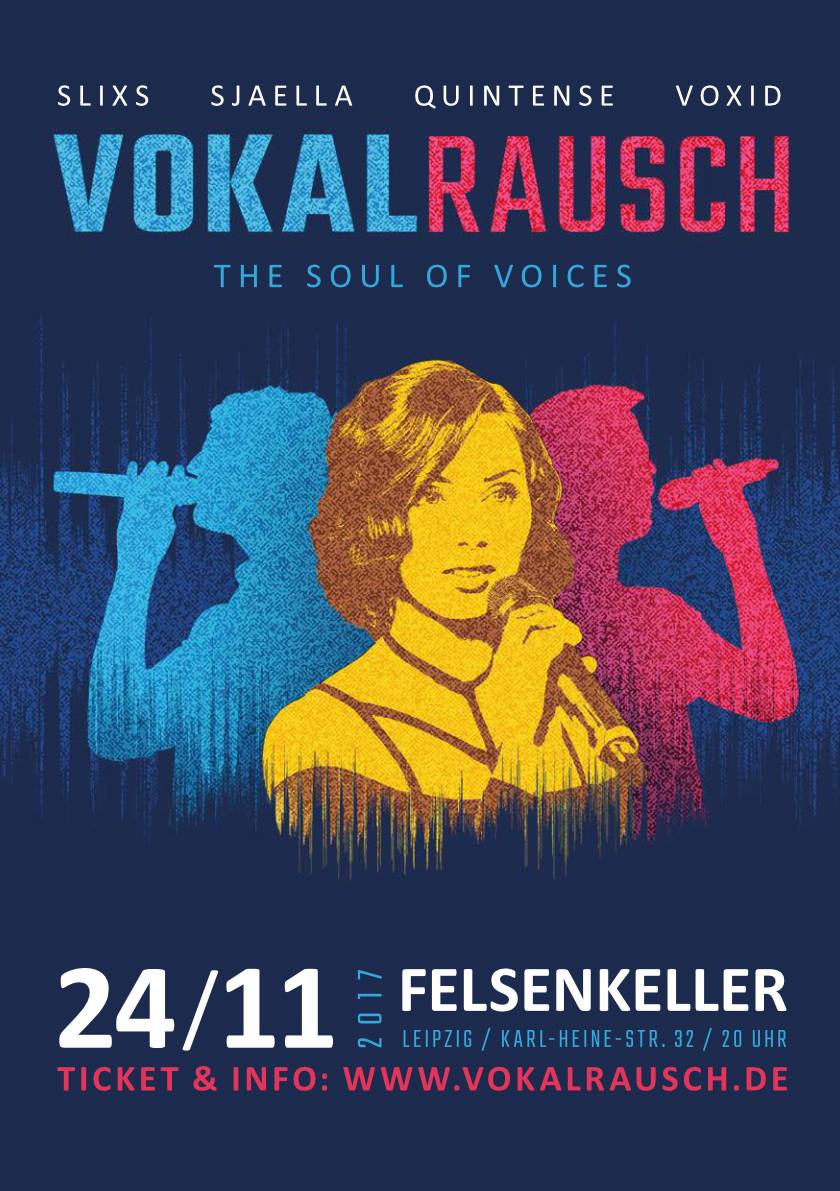 Das A Capella Festival „Vokalrausch“ kommt nach Leipzig. Bereits zum dritten Mal lädt die Vokal Pop Gruppe VOXID die großen Talente aus der Region ein. Im Leipziger Felsenkeller spielen am 24. November – neben den Gastgebern – die Gruppen SJAELLA, QUINTENSE und SLIXS. Zusammengenommen haben diese vier nahezu alle nennenswerten Auszeichnungen aus Vokalwettbewerben in ganz Europa in der Tasche. Damit wird der Abend zum Gipfeltreffen der populären Vokalszene.