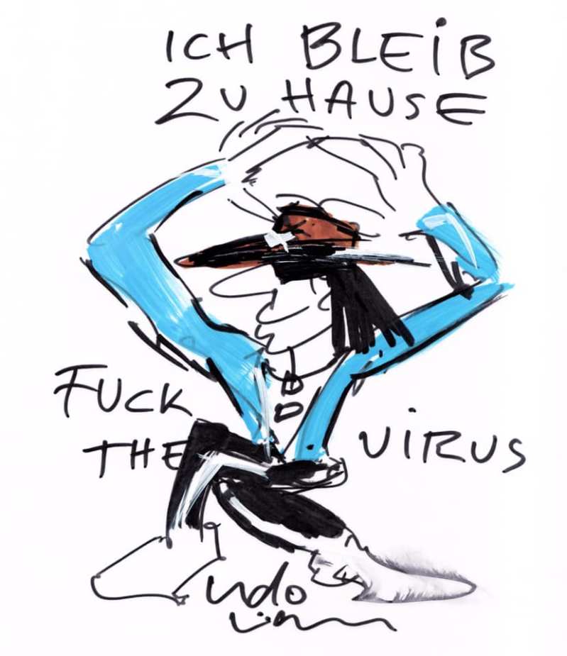 Liebe Freunde. Wir sind im Homeoffice. Danke an alle da draußen, die den Laden am laufen halten. Respekt !! Alles Gute, bleibt gesund und vor allem zu Hause. Damit wir uns schon bald im realen Leben wiedersehen. Zeichnung: Udo Lindenberg