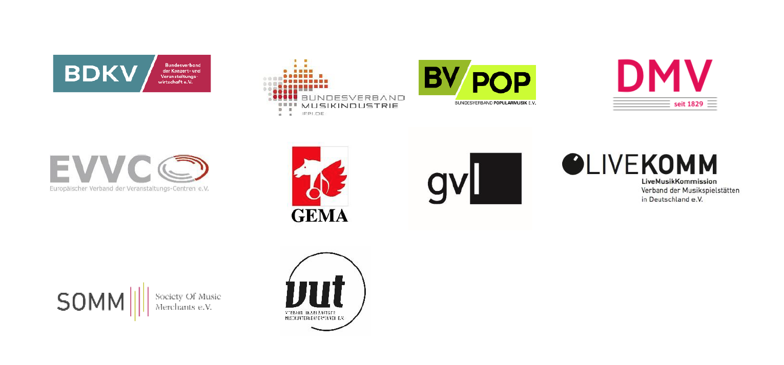 Damit ein „Neustart“ für die Kultur in Deutschland wirkungsvoll und nachhaltig gelingen kann, muss ein Konjunkturpaket nach Auffassung der Verbände diese inhaltlichen wie zeitlichen Wirkungszusammenhänge und die zwingende wirtschaftliche Verkettung der Teilbranchen reflektieren. So stehen in der Musikwirtschaft u.a. Festivalveranstalter mit Tonträgerherstellern, Musikverlagen, Hersteller von Musikinstrumenten und -Equipment, Musikfachhändlern und Verwertungsgesellschaften und natürlich den Künstler*innen selbst in einem wirtschaftlichen Kontext, der mit dem großflächigen Ausfall einzelner Teilbereiche und der weiteren Betroffenheit einzelner Gewerke auf lange Sicht in seiner Gesamtheit existenziell gefährdet wird. Auch für jene Sektoren, die wesentliche negative Effekte dieses Jahres aufgrund von Auszahlungsrhythmen erst im kommenden Jahr zu spüren bekommen, namentlich betrifft dies über die Verteilungen der gemeinsamen Verwertungsgesellschaften der Künstler*innen und deren Partner*innen die Tonträgerhersteller und Musikverlage, braucht es eine Perspektive, um diese Konsequenzen abzufangen.